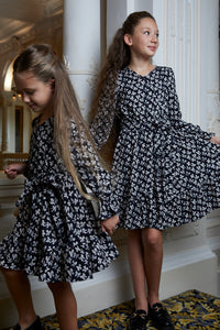 Ontworpen voor kids en met mijn kids. Livia heeft een vaste overslag, waardoor ze wel het effect heeft maar de kinderen toch vrijuit kunnen spelen zonder dat de jurk openvalt. Ze heeft een hoge hals zodat alle hemdjes er netjes onder vallen, en een knoopje aan de achterkant voor het gemakkelijk aantrekken. Een rijke rok en volant langs de hele rand, mouwen met elastische boord en taille voor het fijnste comfort, en de strik die alleen aan de voorkant zit, maken haar helemaal af.