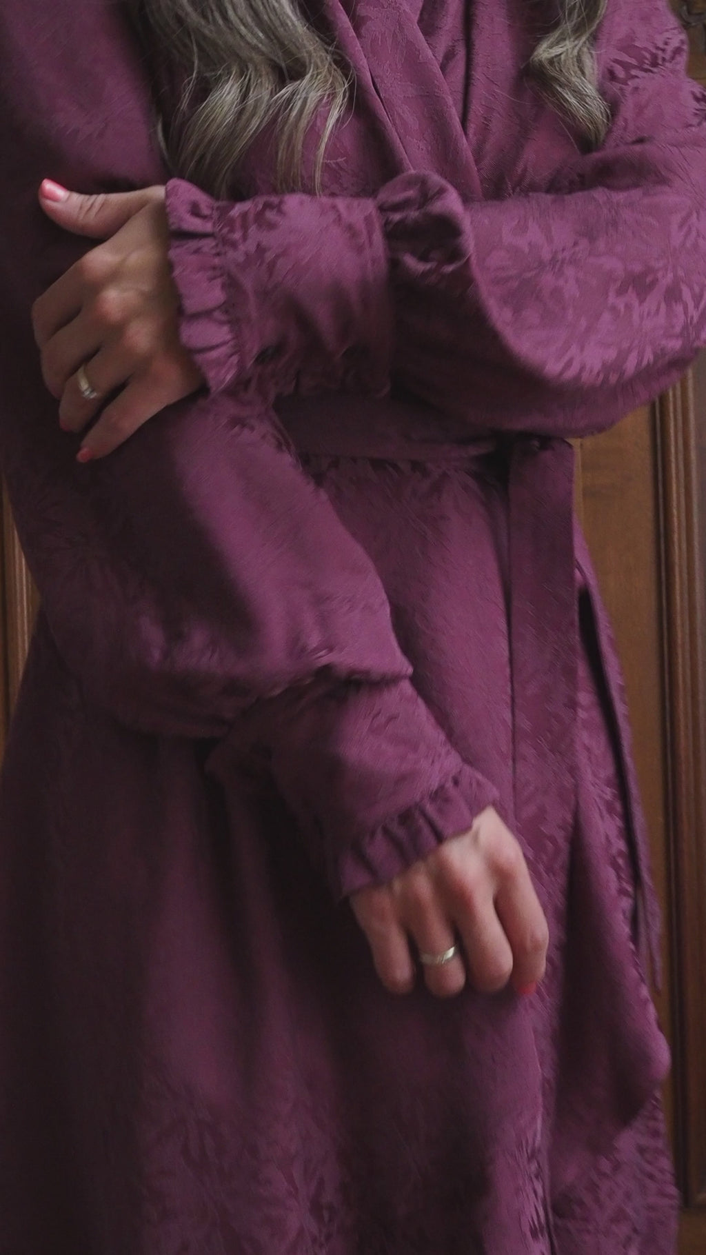 Amely Jacquard is een kort wikkelmodel met een extra lang ceintuur om twee keer rond te dragen en een prachtige strik te maken. Haar diepe, rijke donkerpaarse kleur heeft een ingeweven bloem. Doordat zij niet te zwaar is, blijft ze eindeloos om je heen dansen. Haar mouwen zijn tot in de puntjes verfijnd en hebben een van de meest gedetailleerde afwerkingen. Haar subtiele volant loopt langs de volledige boord, afgewerkt met twee knopen. Haar halslijn heeft een omslag voor een rijke uitstraling in de top, maar ook om haar prachtig te laten draperen over de borst. De volant om de rok is dubbel gevoerd, zodat je altijd tegen de mooiste kant van de stof aankijkt, wat haar rok een zwaarder gevoel geeft.
