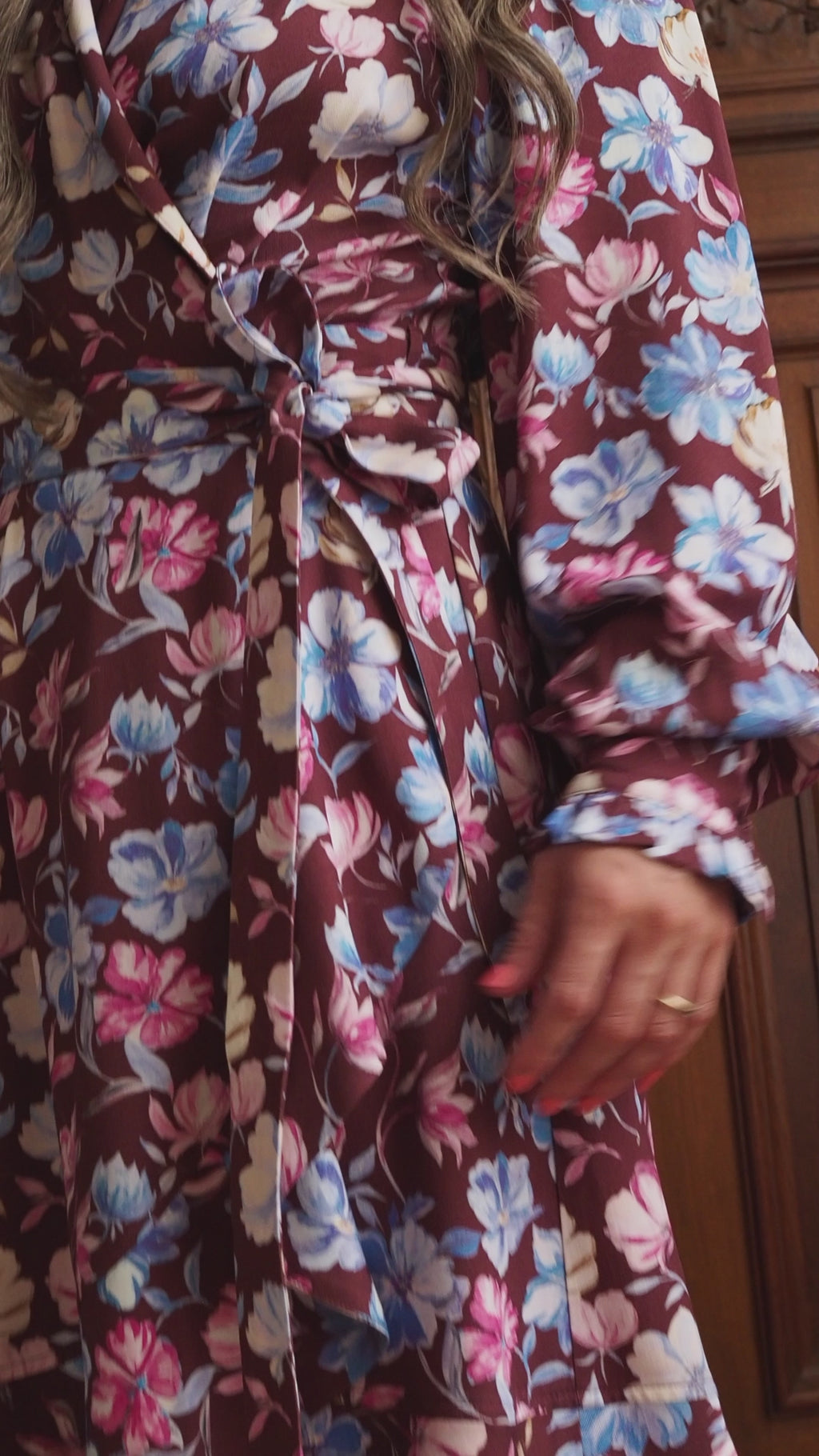 Amely is een kort wikkelmodel met een extra lang ceintuur om twee keer rond te dragen en een prachtige strik te maken. Haar mouwen zijn tot in de puntjes verfijnd en hebben een van de meest gedetailleerde afwerkingen. Haar subtiele volant loopt langs de volledige boord, afgewerkt met twee knopen. Haar halslijn heeft een omslag voor een rijke uitstraling in de top, maar ook om haar prachtig te laten draperen over de borst. Haar volant om de rok is dubbel gevoerd, zodat je altijd tegen de mooiste kant van de stof aankijkt, wat haar rok een zwaarder gevoel geeft. De print heeft alle rijke herfst- en winterkleuren.